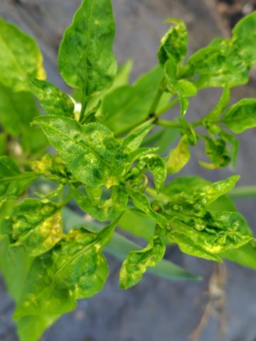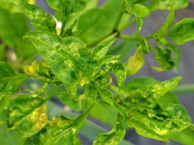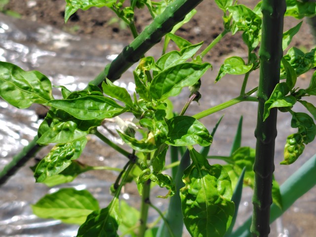 万願寺とうがらしの成長点付近の葉っぱが縮れているのよ。