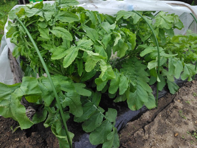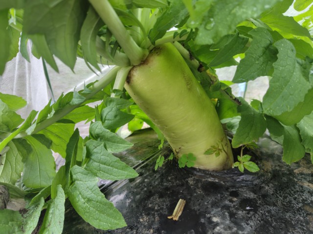 不織布トンネル内で育てている大根が、窮屈そうになってきたので、収穫することにした。